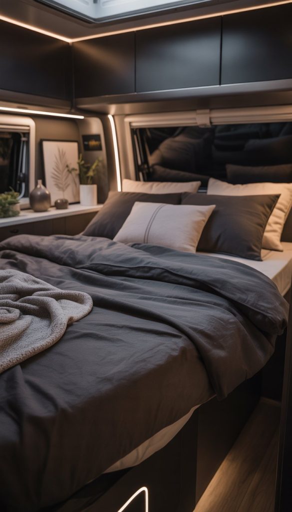 Using coal-colored bedding creates a strong, calm base for your RV bedroom. Dark colors make the space feel cozy, like a warm retreat after a long day. The key is to balance it with soft linens that add comfort without making the room feel heavy.