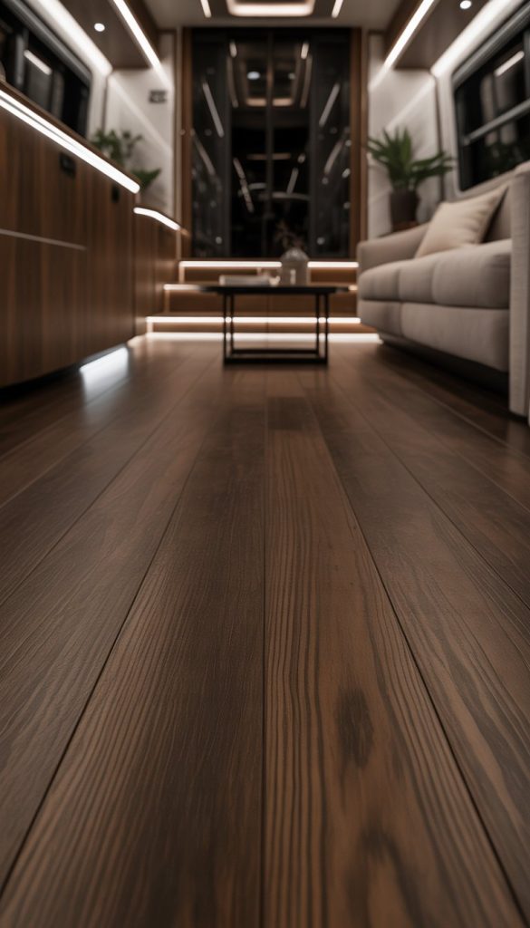 Dark wood flooring adds depth to your RV’s interior. It creates a warm, elegant base that pairs well with lighter walls and furniture.