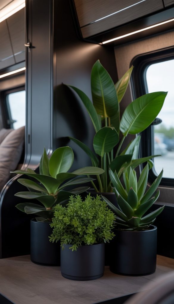 Adding deep green indoor plants can bring fresh life to your RV’s dark interior. The rich green color stands out well against darker walls or furniture. It adds a touch of nature without making the space feel loud or busy.