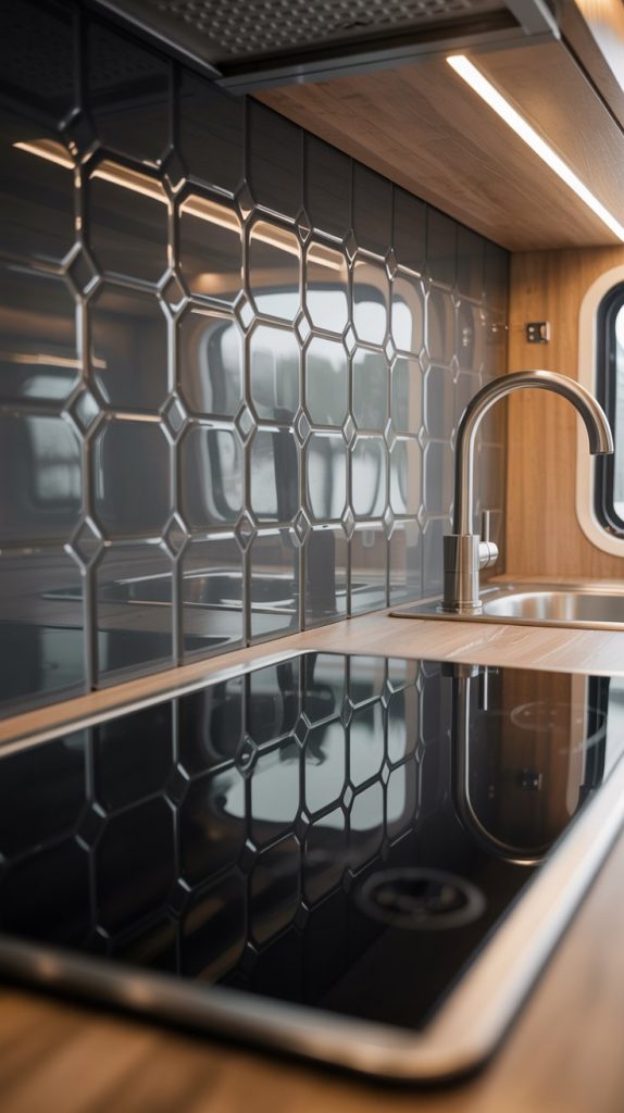 An etched black glass backsplash can give your RV kitchen a sleek and modern look. It adds a smooth, shiny surface that is easy to clean. The etched patterns create subtle designs that bring texture without making the space feel busy.