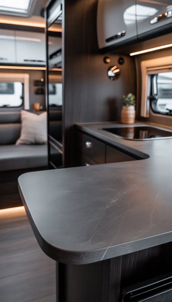 Choosing graphite gray stone countertops gives your RV a sleek, modern look. The dark color adds depth without making the space feel too heavy.
