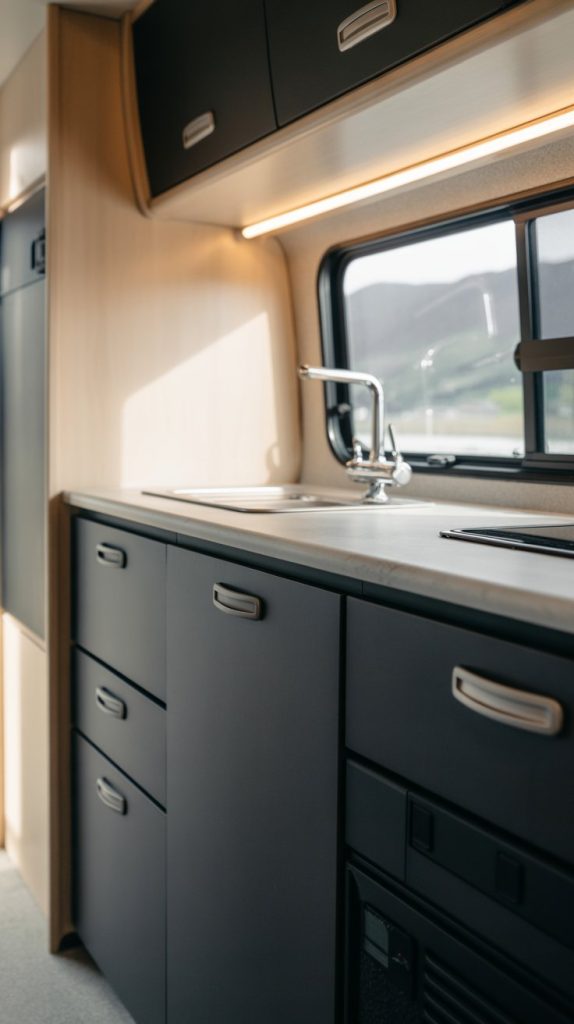 Matte black cabinetry can add a strong, modern look to your RV. It creates a sharp contrast against lighter walls and countertops. This contrast makes the space feel more stylish and put-together.