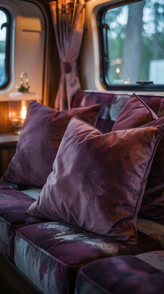 Adding moody plum velvet throw pillows can bring a rich, cozy look to your RV interior. The deep color adds a touch of luxury without being too bright or flashy. Velvet also offers a soft texture that invites you to relax.
