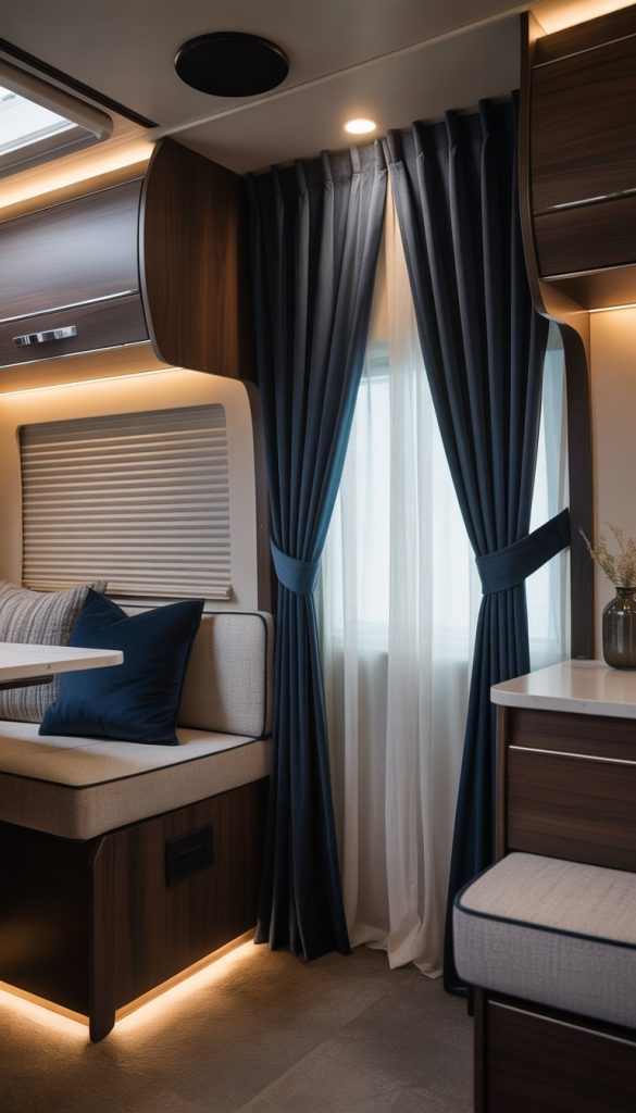 Velvet navy curtains can make your RV feel cozier and more elegant. The rich texture of velvet adds a soft touch that darkens the space without making it feel small.