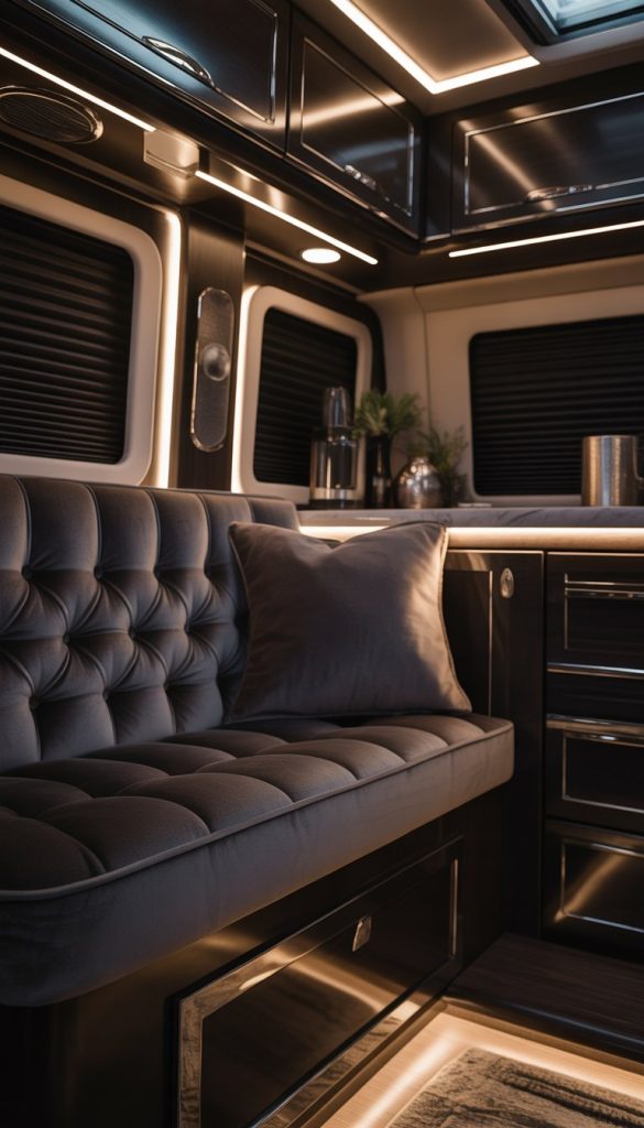 Velvet tufted bench seating adds a rich, cozy touch to your RV interior. The soft texture feels nice and invites you to relax. Its tufted design gives a classy, timeless look that fits well with dark color schemes.