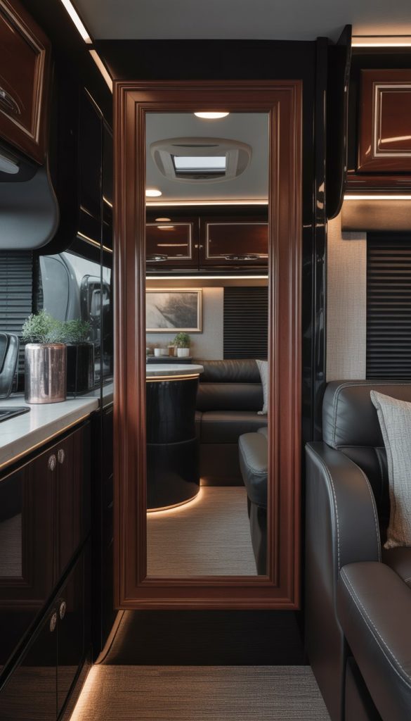 Deep mahogany frame mirrors add warmth and style to your RV’s interior. The rich, dark wood brings a touch of elegance and makes small spaces feel cozier. These mirrors are perfect for catching light and making your RV look bigger without losing that sophisticated vibe.