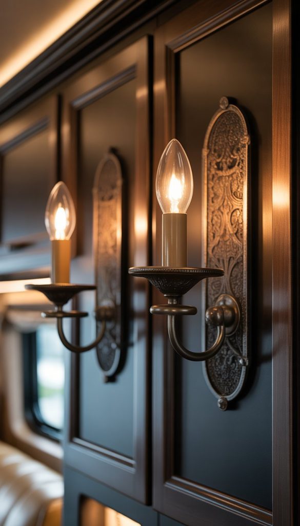 Antique black metal wall sconces bring a timeless look to your RV’s interior. They add a touch of elegance while keeping the lighting soft and warm.