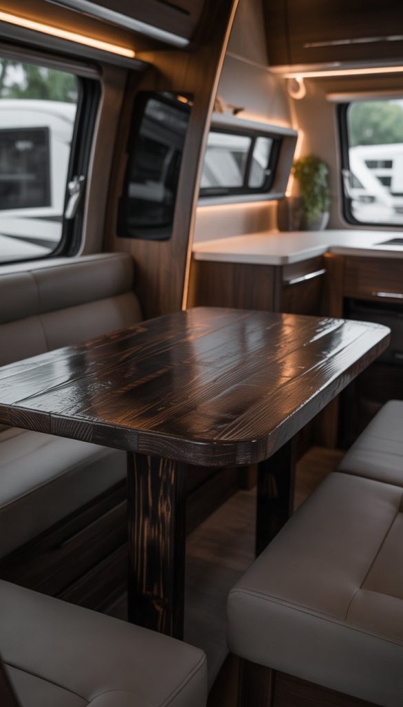 A dark stained reclaimed wood dining table adds a rich and timeless feel to your RV interior. The deep color brings warmth and elegance, making your dining area a cozy spot to gather. Its natural wood texture gives character and a unique look.