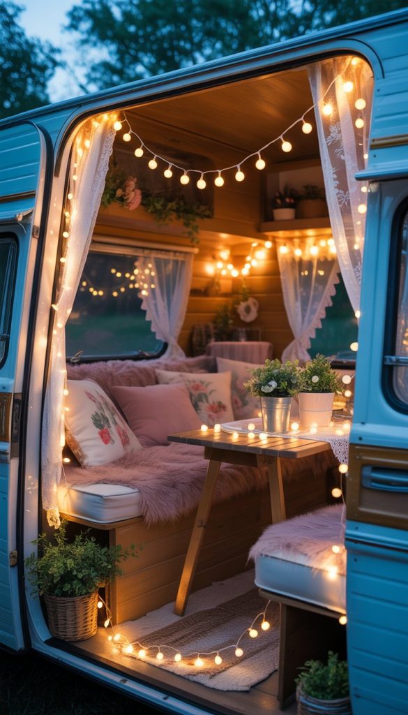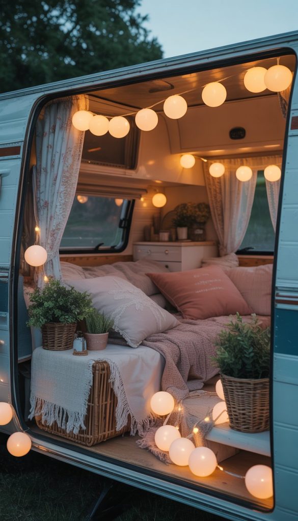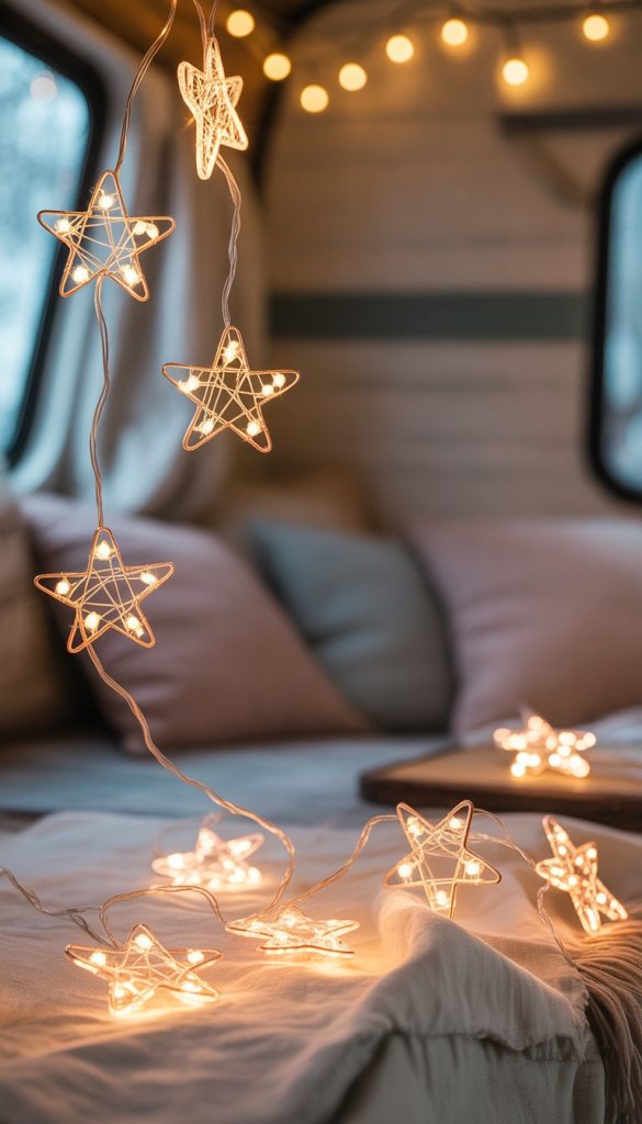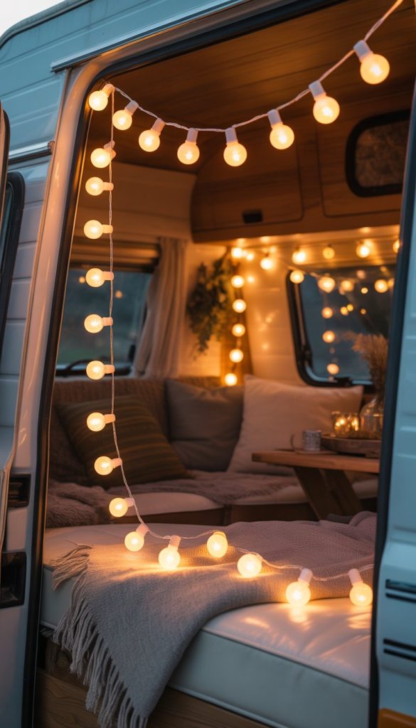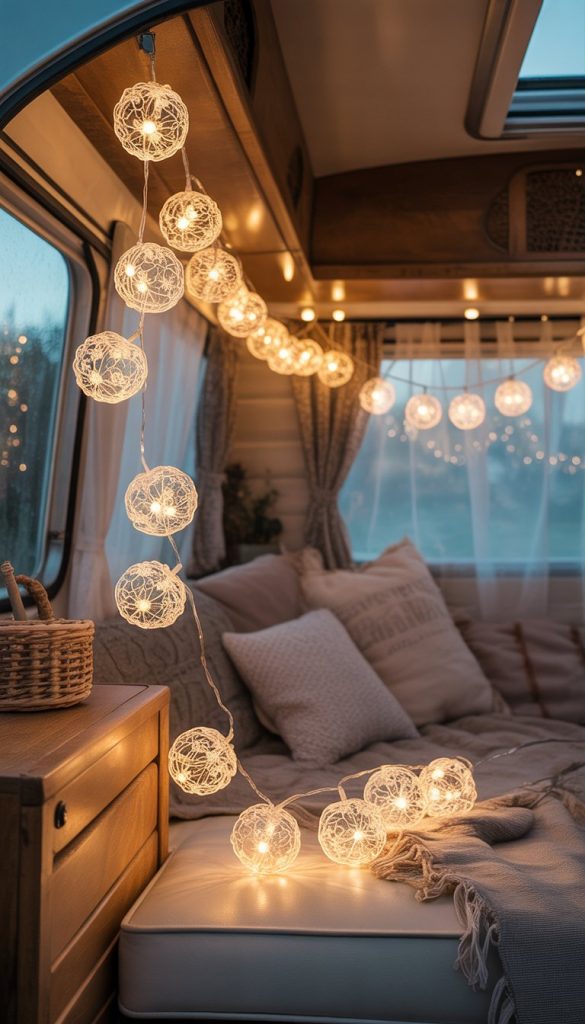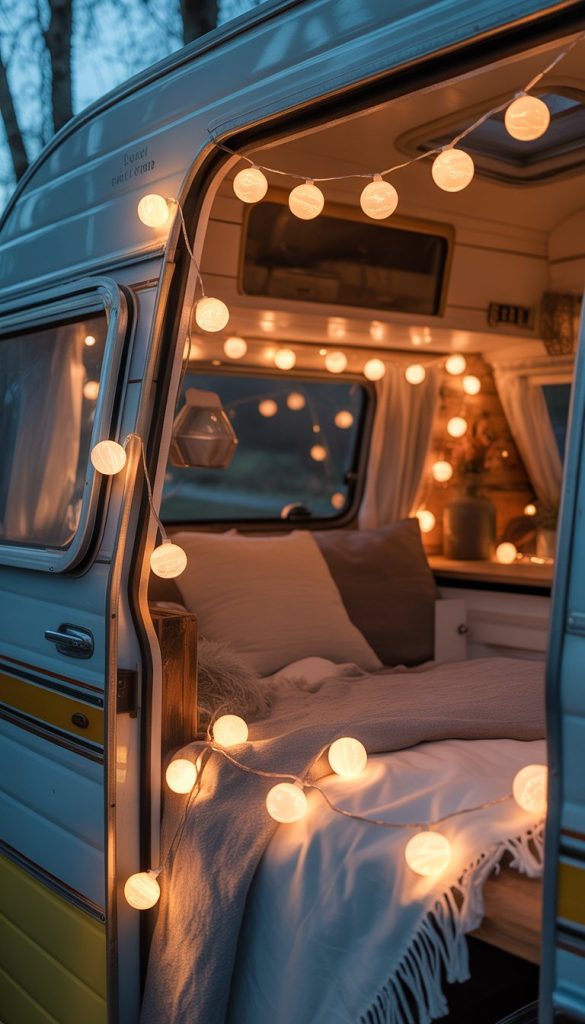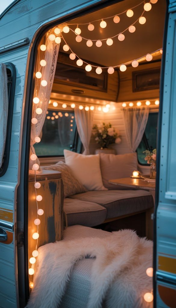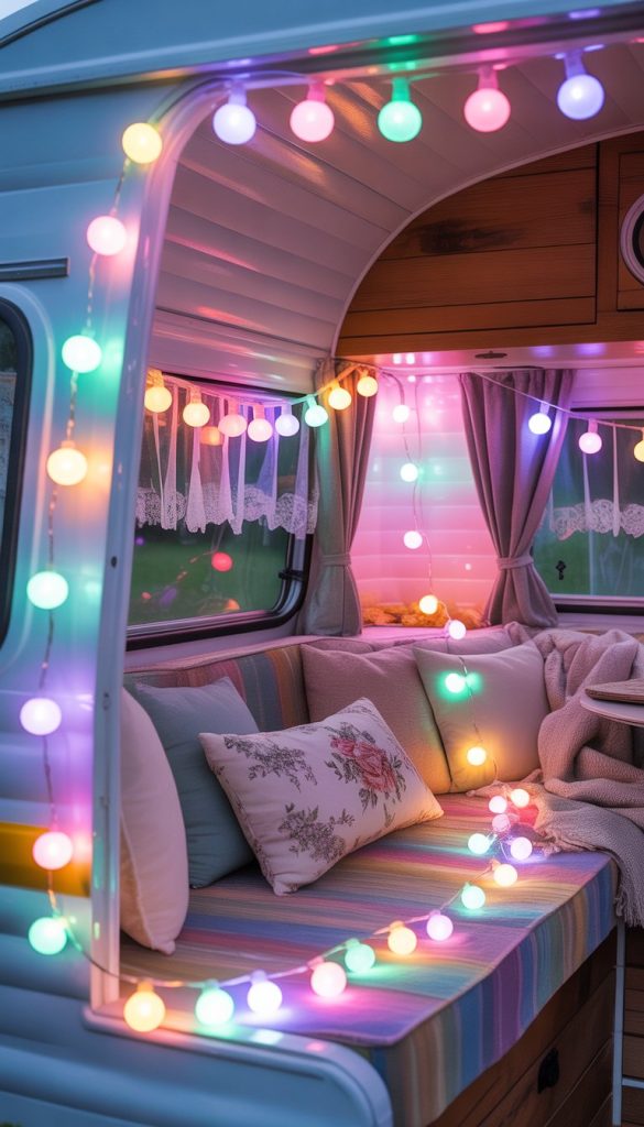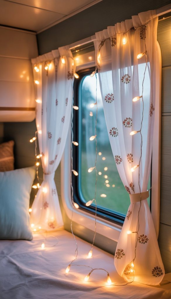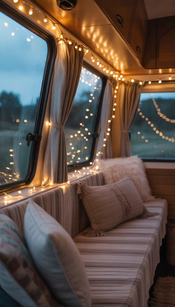 Twinkle lights are a simple way to add charm to your camper. Draping them over windows creates a soft glow that makes your space feel cozy. They also highlight the natural light during the day.