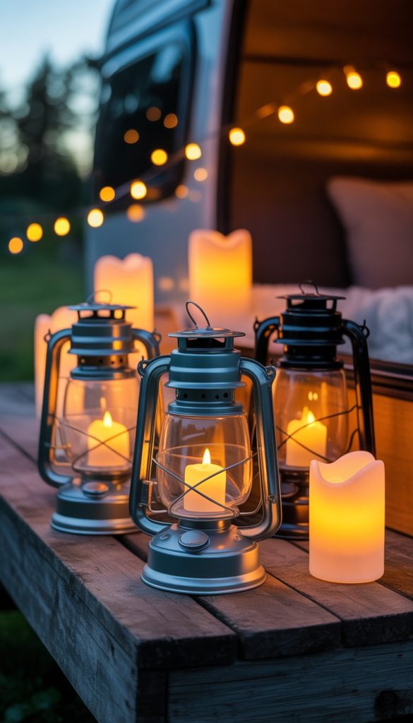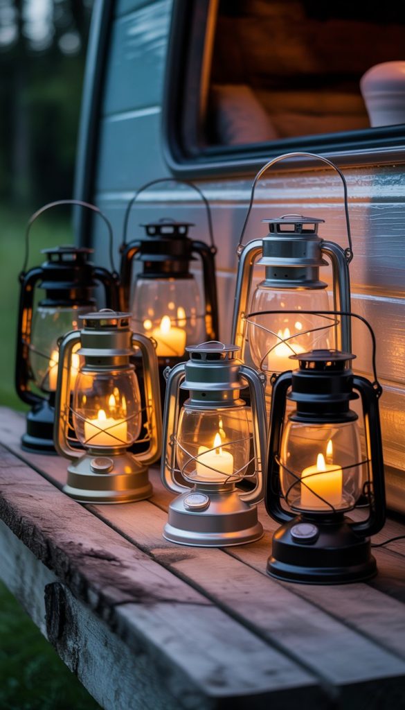 You can place these lanterns on shelves, tables, or hang them near windows. They come in many shapes and sizes to fit your camper’s style. Plus, they use little energy, so they won’t drain your camper’s batteries.