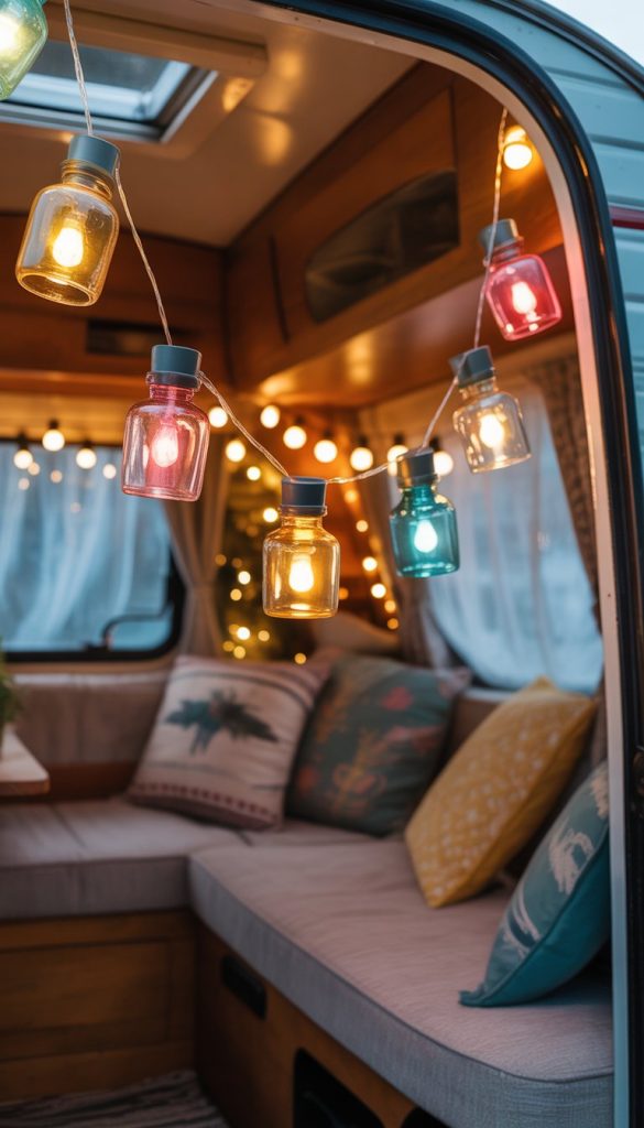 Try placing bubble lights inside glass jars or lanterns. This adds an extra touch of whimsy and keeps the lights safe while making your camper look even cozier.