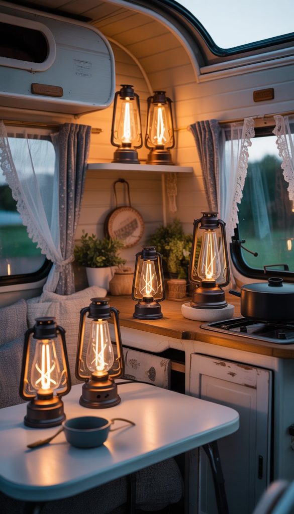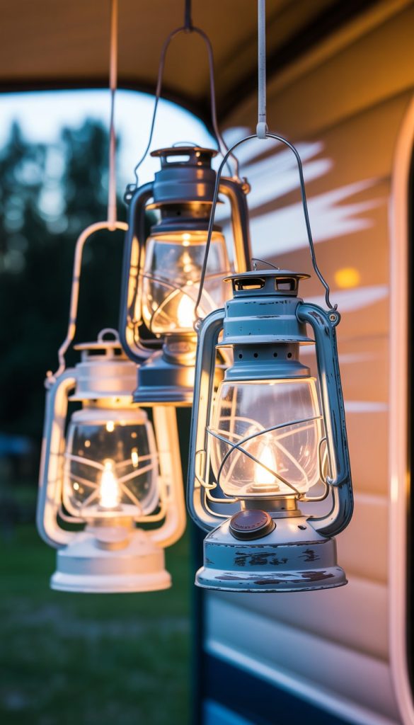 Hanging lanterns with distressed paint add a soft, vintage touch to your camper. They bring charm and warmth without needing a lot of electricity. You can hang them from hooks or ropes to light up different corners.