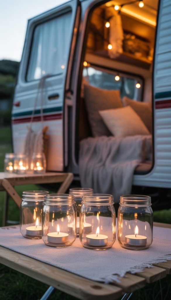 Mason jar lanterns are a simple way to add soft light to your camper. You just need a few glass jars and battery-operated tea lights. These create a warm and cozy glow without taking up much space.