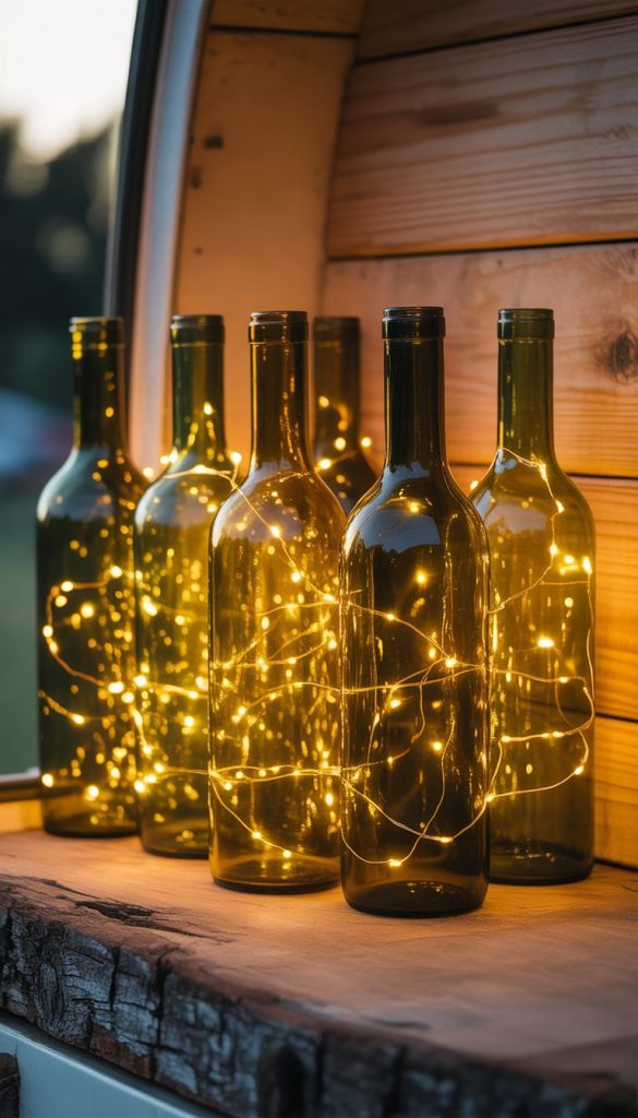 Using empty wine bottles to hold clustered fairy lights is a simple way to add charm to your camper. The bottle acts like a colorful lantern that glows softly. It fits perfectly with the shabby chic style by recycling old items.