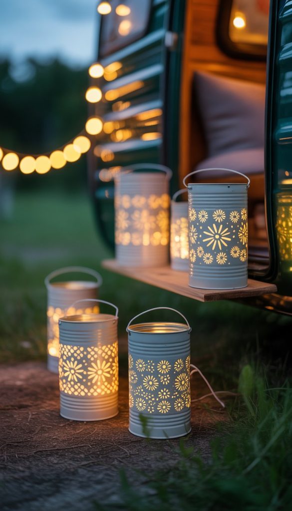 Tin can lanterns are a simple and charming way to add light to your shabby chic camper. You can reuse old cans by cleaning them and punching small holes in fun patterns. When you place a candle or LED light inside, the light shines through the holes, creating a cozy glow.