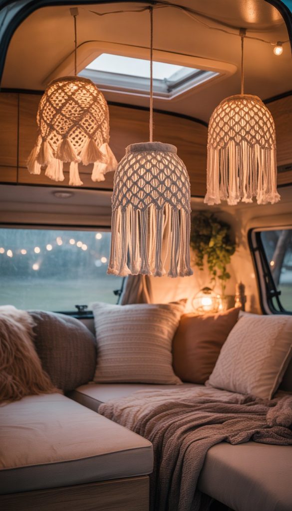 Choose a lamp shade with open patterns so light spreads evenly. You can also switch out the bulb for color-changing LEDs to create different moods. Macramé adds texture without overwhelming your camper’s style.