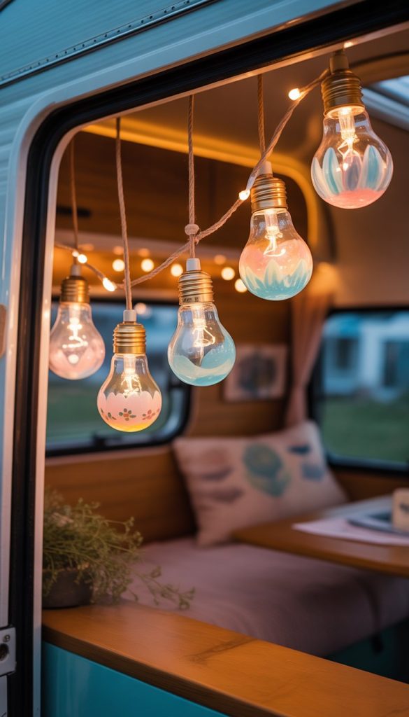 Hand-painted glass bulb lights add a personal touch to your shabby chic camper. Each bulb is unique, with soft colors or floral designs that fit your cozy style. They create a gentle glow, perfect for relaxing evenings.