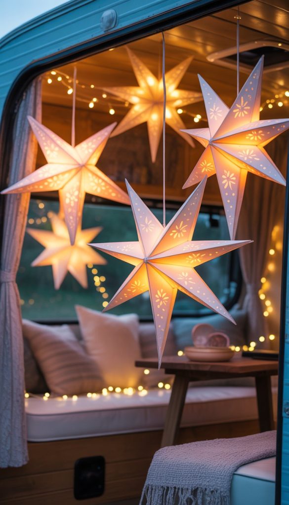 Use battery-powered fairy lights inside your paper mache stars. This way, you avoid any cords and keep your camper clutter-free. It’s a simple step that keeps your space looking neat and magical.