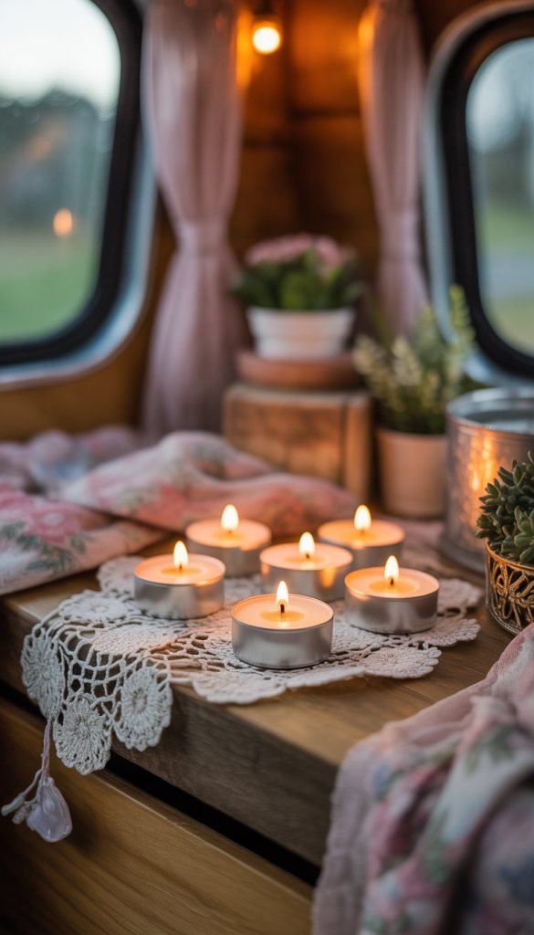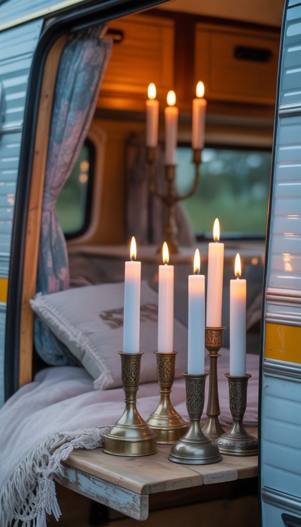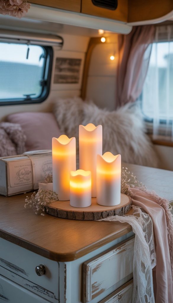 Electric candles give the warm look of real flames without the fire risk. You can place them in old candle holders to keep a vintage shabby chic style. This mix looks charming and keeps things safe inside your camper.