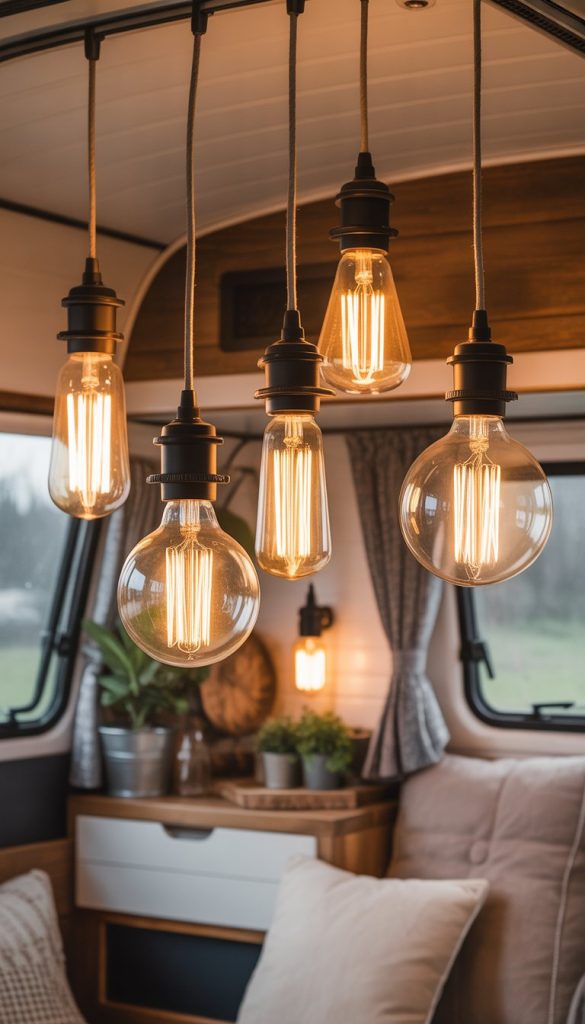 Vintage Edison bulb pendant lights add a warm, soft glow to your shabby chic camper. These bulbs show off their unique filament design, giving a cozy and old-fashioned feel. Hanging them in your camper creates a welcoming spot for relaxing or reading.
