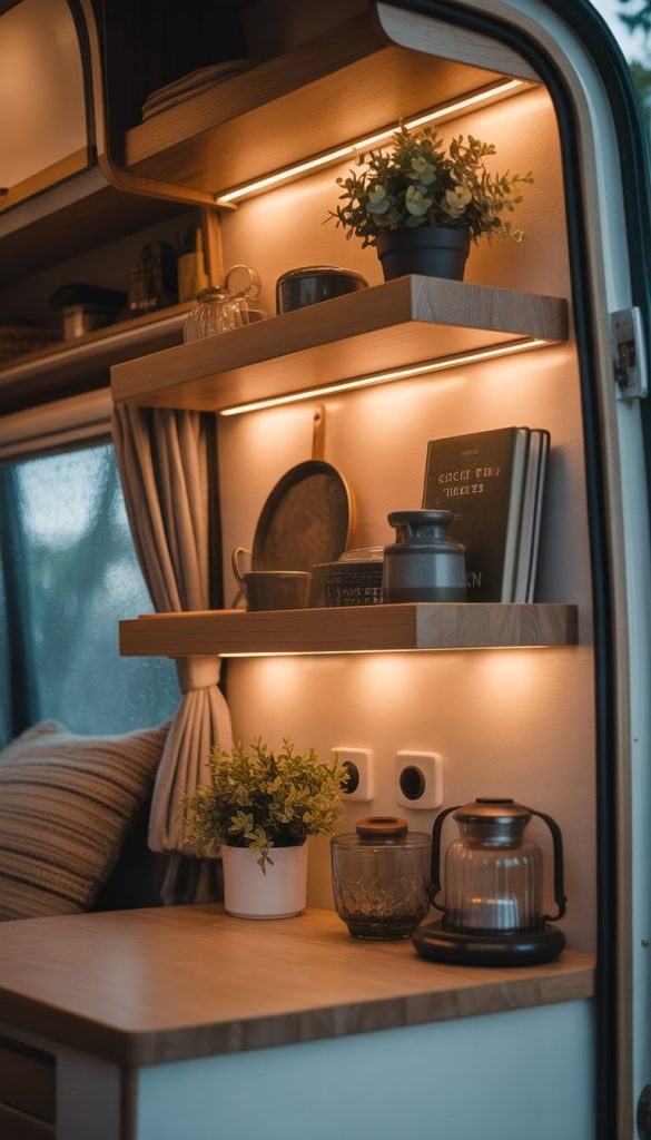 Adding soft glow LED strip lights under your camper’s cabinets gives you gentle, even lighting. This helps brighten up dark corners without being too harsh on your eyes.
