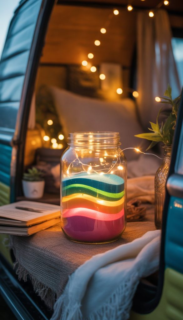 Glass jar lights with colored sand can add a cozy and charming touch to your shabby chic camper. You simply fill clear glass jars with different colors of sand. Then, place small fairy lights or LED candles inside the jars.