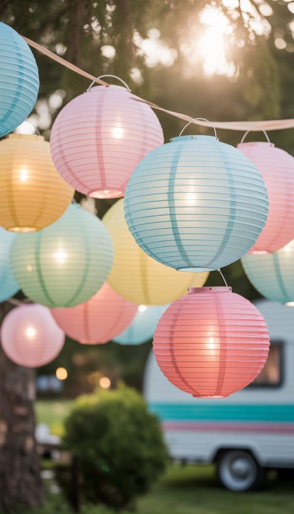 Paper lanterns in soft pastel colors bring a gentle, cozy glow to your shabby chic camper. They add a light and airy feel that matches the relaxed, vintage style. You can hang them from the ceiling or string them along the walls for a sweet, charming look.