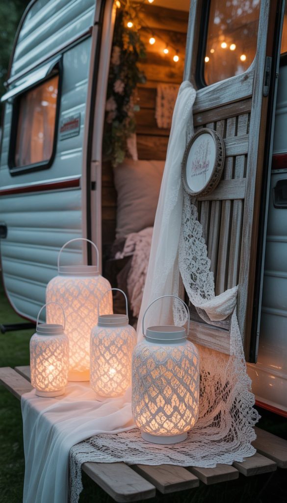 Lanterns wrapped in lace create a soft and cozy glow inside your shabby chic camper. The lace adds a delicate touch and makes the light look warm and inviting. You can use old lanterns or buy new ones and simply wrap lace fabric around them.