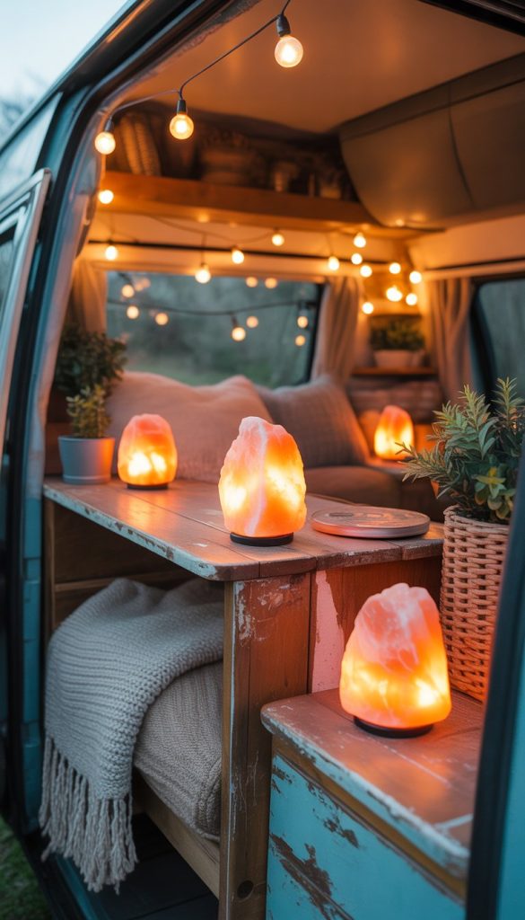 Himalayan salt lamps add a soft, warm glow to your camper. Their pink and orange tones create a calm and relaxing space. They are perfect for reading or unwinding after a day outside.