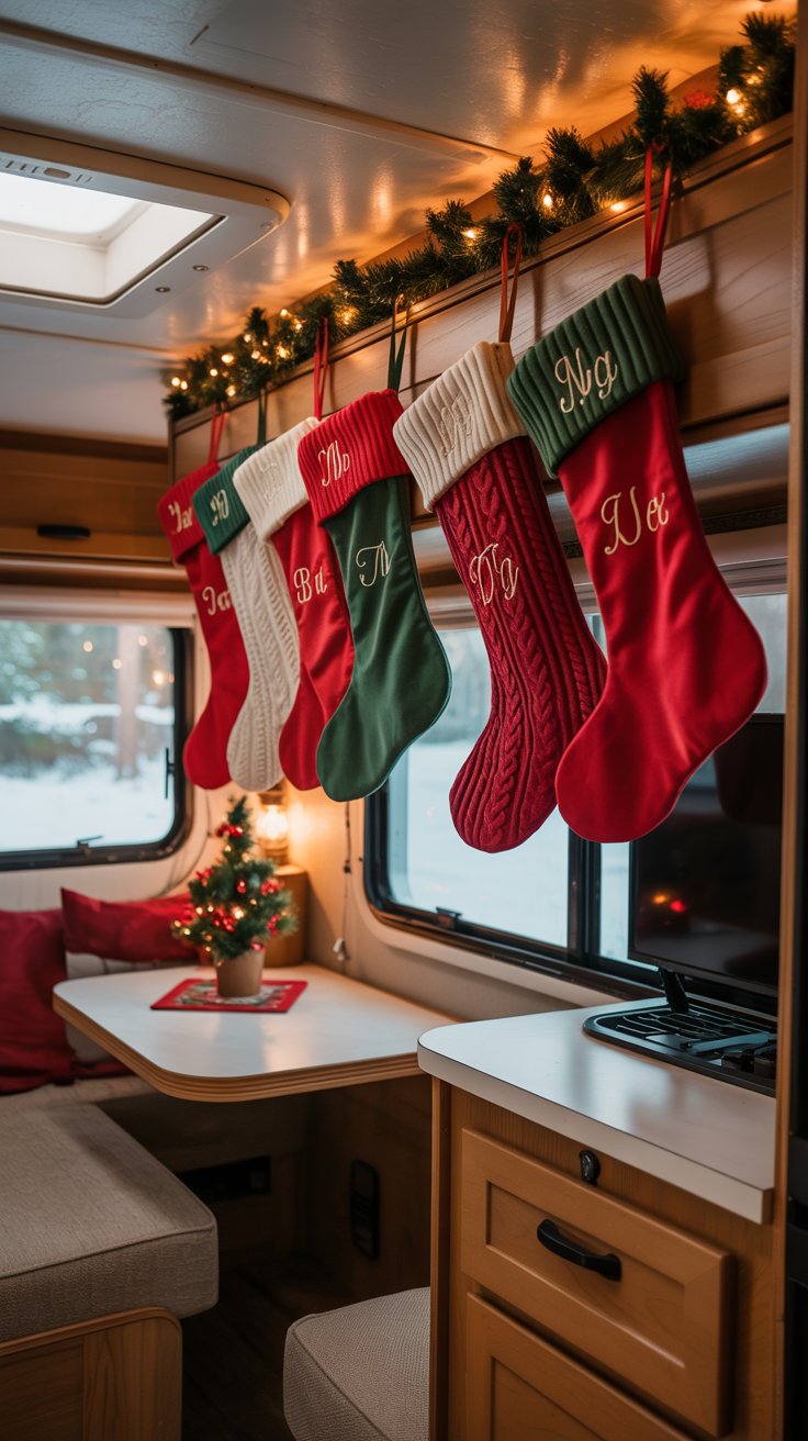 Consider creating a dedicated stocking wall by installing a decorative rod or ribbon across a section of wall specifically for this purpose. Mini stockings work better than full-size ones in tight spaces, and they’re easier to fill with small gifts and treats perfect for RV storage constraints. Coordinate stocking colors and patterns with your overall holiday theme—traditional red and white, rustic burlap and plaid, or coastal blue and white for snowbirds in warm climates.
