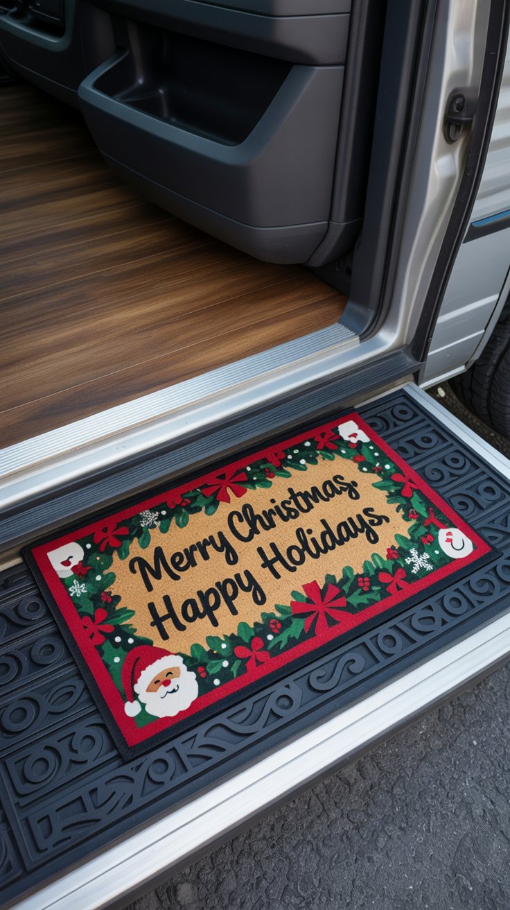 A festive holiday doormat creates an inviting entrance to your RV while serving the practical purpose of catching dirt and moisture. Choose doormats featuring Christmas greetings like “Merry Christmas,” “Happy Holidays,” or “Welcome” along with seasonal graphics such as wreaths, snowflakes, Santa, or winter scenes. Outdoor-rated mats withstand weather exposure and frequent foot traffic while maintaining their appearance throughout the season. The doormat signals your holiday spirit to visitors and fellow campers before they even knock.
