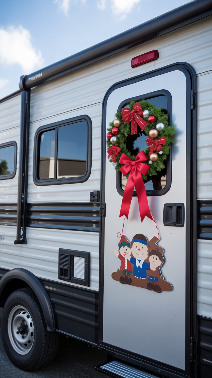 Hang your wreath using an over-the-door wreath hanger designed for RV doors, which won’t scratch the finish or interfere with the door’s seal. Alternatively, use strong adhesive hooks rated for outdoor use and your door’s material. Complete the entrance area with a festive welcome mat featuring holiday designs, and consider adding small potted evergreens or poinsettias flanking your doorway if you’ll be stationary for the season.