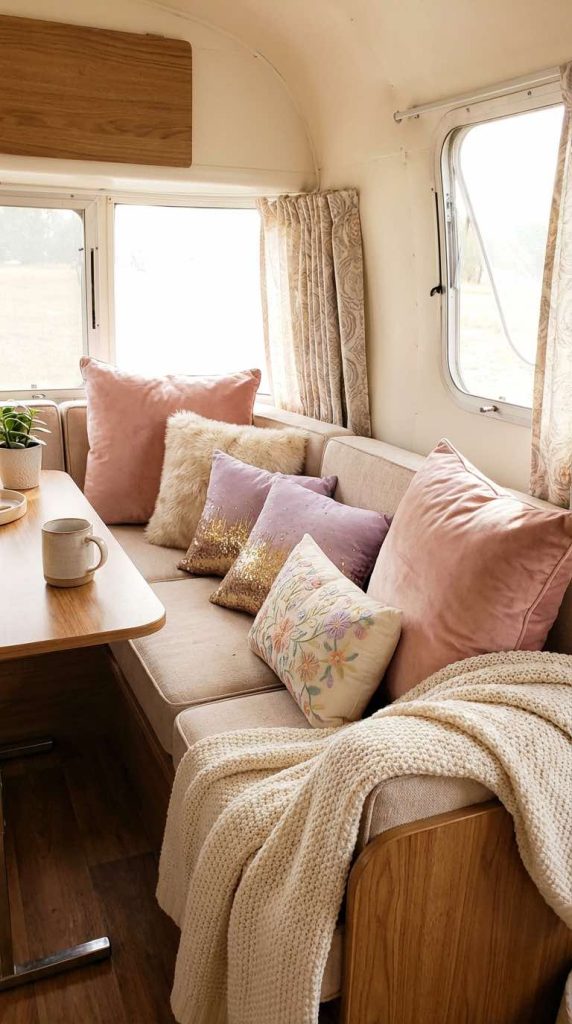Layer your RV seating areas with an abundance of decorative throw pillows in various textures, patterns, and feminine colors. Mix velvet, faux fur, sequins, embroidered, and linen pillows in coordinating shades of blush, lavender, cream, and soft gray. This simple decorating technique instantly elevates the comfort and style of your space while allowing for easy seasonal changes. Pillows provide both visual softness and physical comfort, making your RV feel more like a cozy home.