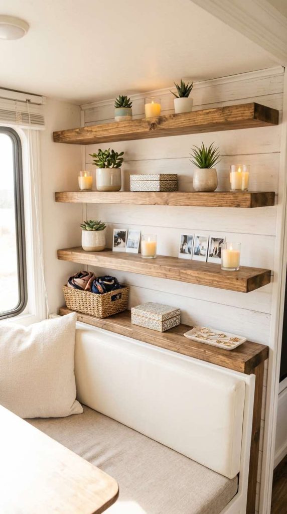 Choose shelf styles and finishes that complement your overall RV aesthetic—rustic wood for bohemian charm, white for cottage style, or mirrored for glamorous appeal. Vary the heights and lengths of multiple shelves to create visual interest and accommodate items of different sizes. Use the styling rule of threes—group items in odd numbers for the most pleasing arrangements. Rotate displayed items periodically to keep your space feeling fresh and to showcase new treasures collected during travels.