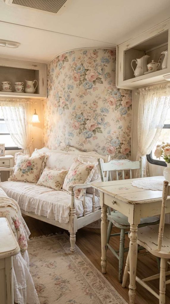 Select wallpaper patterns that complement your existing color scheme and furniture style. Large-scale floral patterns work well in bigger RVs, while smaller prints suit compact spaces better. The romantic vintage aesthetic of floral wallpaper pairs beautifully with white or cream furniture, antique accessories, and soft textiles. This single design element can serve as the inspiration for your entire RV color palette and decorating scheme.