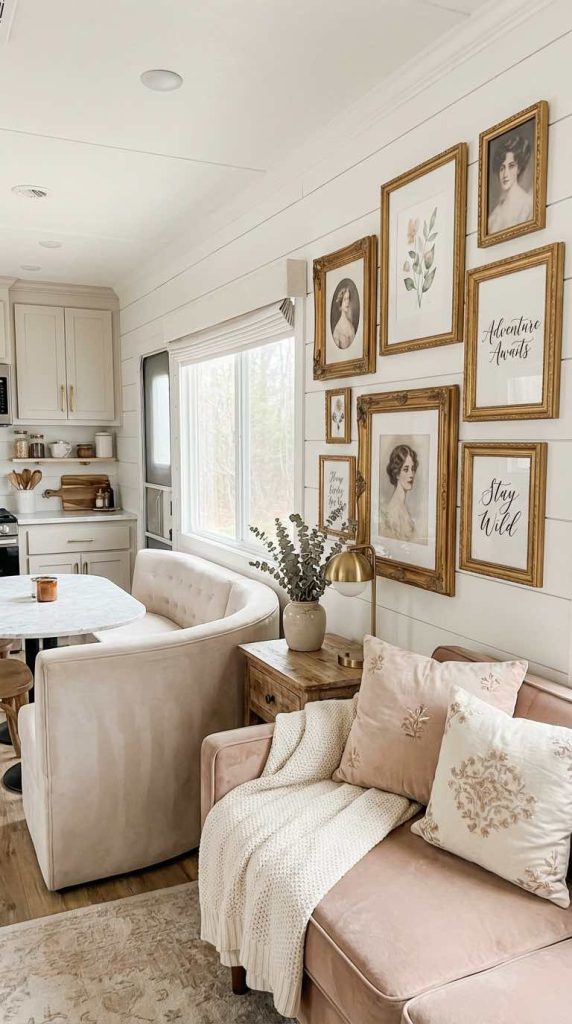 Create a stunning focal point in your RV with a carefully curated gallery wall featuring gold ornate frames. Mix different sizes and styles of frames to add visual interest and personality to your space. Fill them with botanical prints, inspirational quotes, vintage postcards, or personal photographs that tell your travel story. The warm metallic tones of gold frames add a touch of elegance and sophistication to any RV interior.