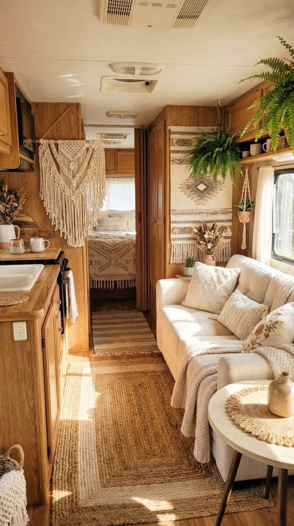 Add bohemian feminine charm to your RV with beautiful macramé wall hangings in natural cream and beige tones. These handcrafted textile pieces bring texture, warmth, and artistic interest to your walls without taking up precious floor space. Choose from various styles including large statement pieces, smaller accents, or even macramé plant hangers that combine décor with greenery. The organic, handmade quality of macramé perfectly complements a relaxed, feminine aesthetic.