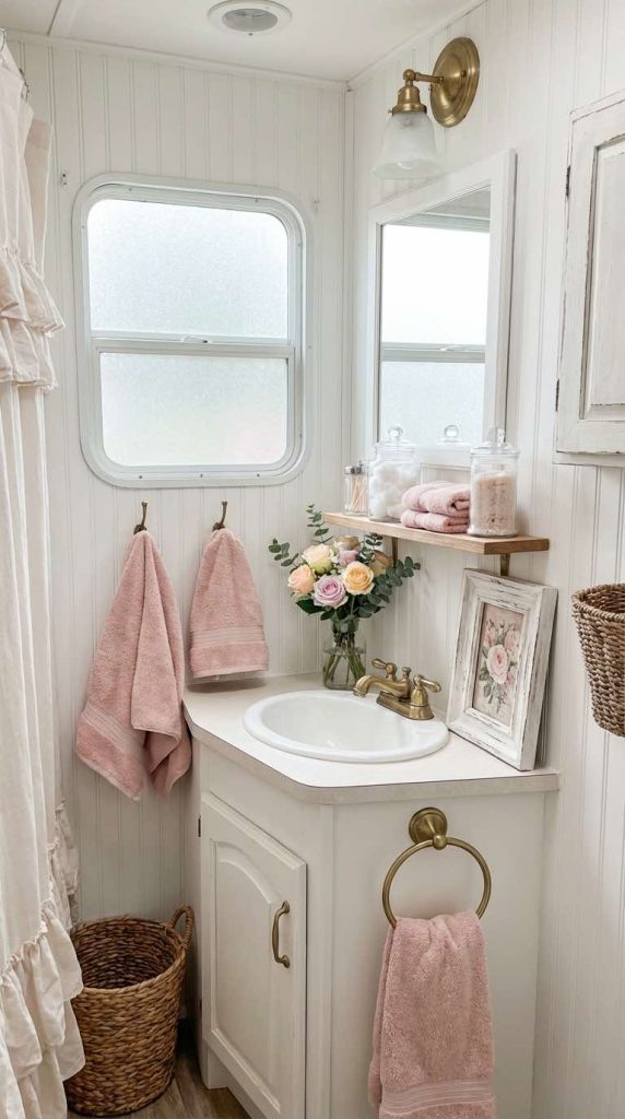 Transform your RV bathroom into a charming cottage-style retreat with vintage-inspired décor elements. White beadboard walls or peel-and-stick panels create texture and classic appeal. Replace standard fixtures with vintage-style brass faucets and hardware for an antique look. Display apothecary jars filled with cotton balls, bath salts, and toiletries on open shelving. Add soft pink hand towels, a vintage mirror, and a small vase of fresh flowers to complete the shabby chic bathroom aesthetic.