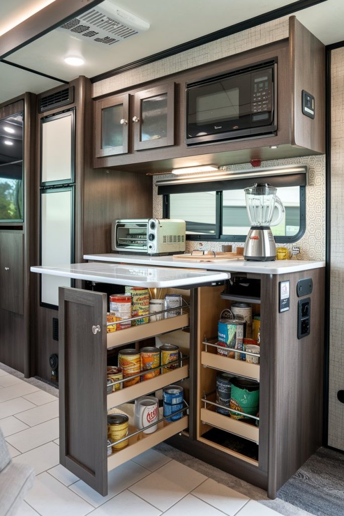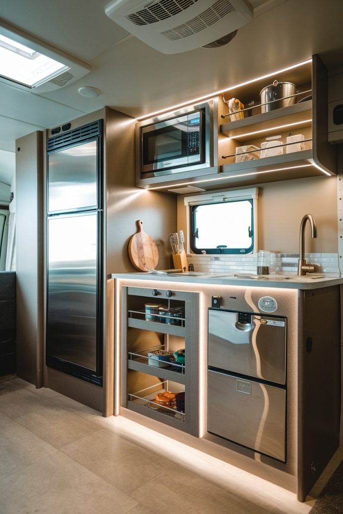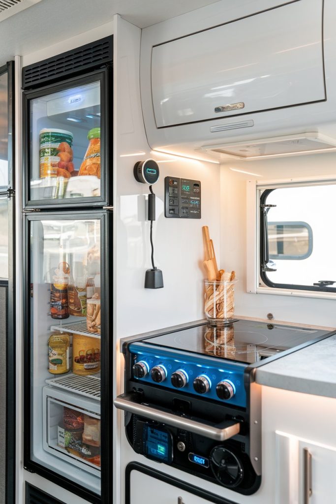 This high-tech kitchen layout is perfect for those who love gadgets and smart appliances. Featuring a smart fridge, a touch-screen stove, and voice-activated lighting, this kitchen brings the future to your RV. The integration of technology makes cooking more convenient and enjoyable.