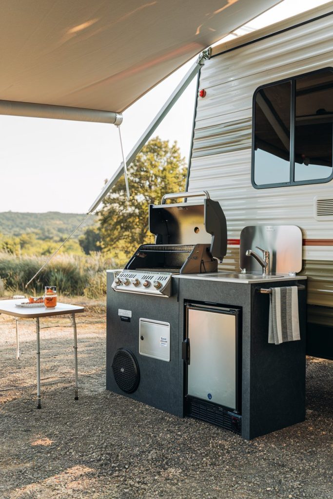 This unique layout features an outdoor kitchen area, perfect for those who love to cook and dine al fresco. Equipped with a grill, a sink, and a mini-fridge, this setup allows you to enjoy the great outdoors while preparing delicious meals. The retractable awning provides shade and protection from the elements.