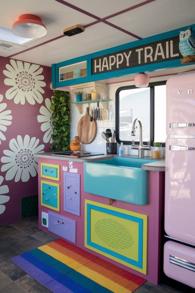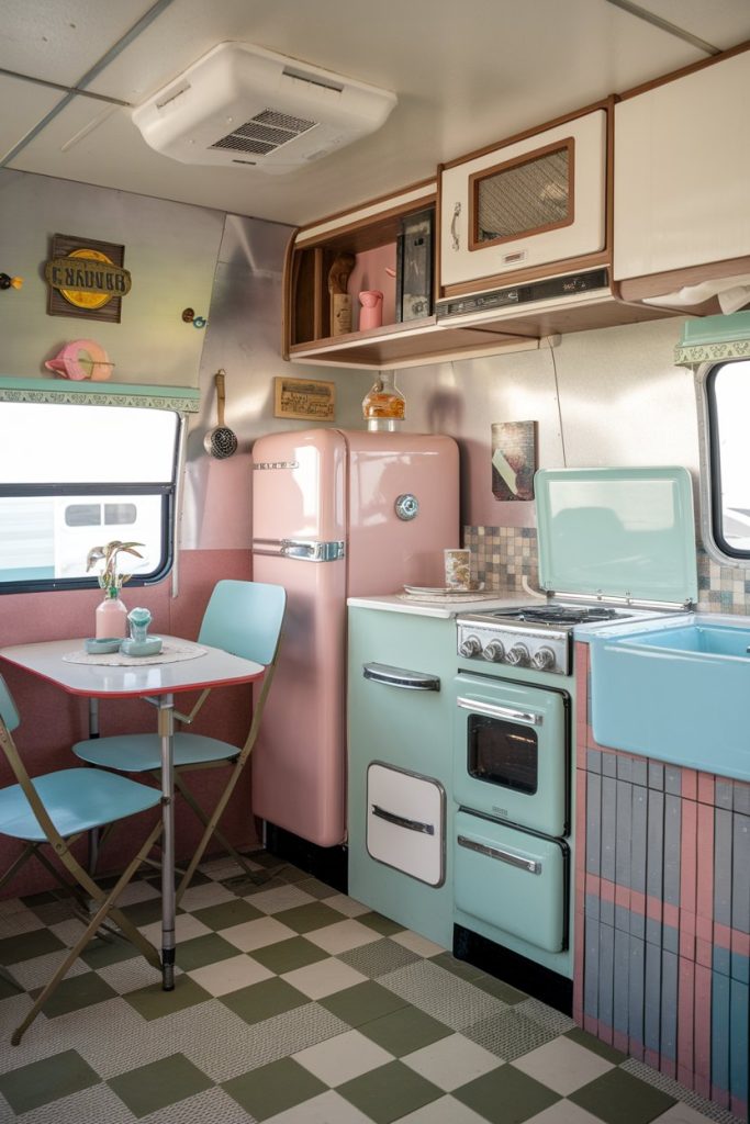This layout combines the charm of a farmhouse kitchen with the functionality needed for RV living. Featuring shiplap walls, a farmhouse sink, and rustic decor, this kitchen is both stylish and practical. The use of open shelving and vintage accents adds to the farmhouse appeal.