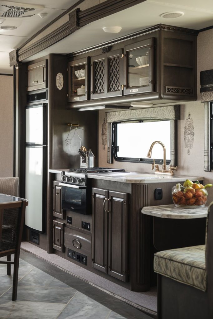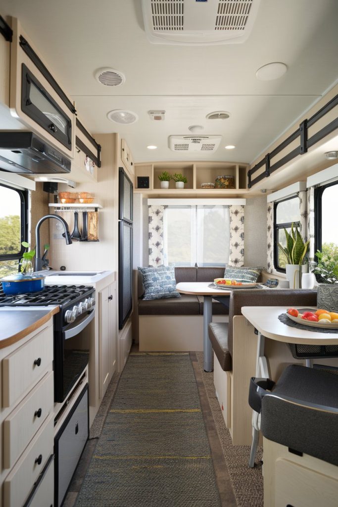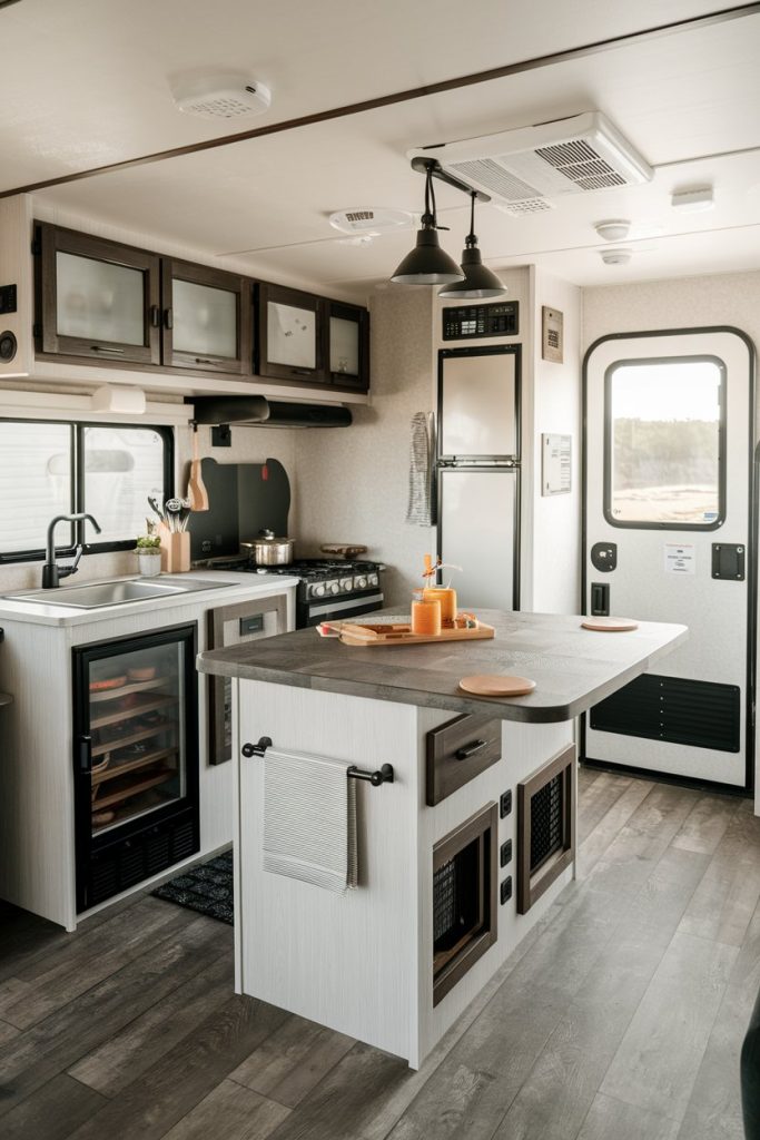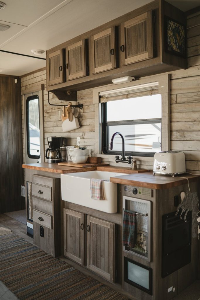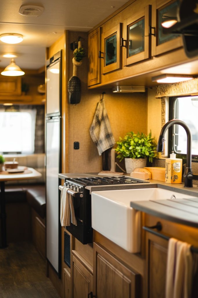 Imagine cooking in a kitchen that feels like a cozy cabin in the woods. This layout features wooden cabinets, a farmhouse sink, and a small oven. The use of natural materials and warm lighting creates a welcoming atmosphere that makes you forget you’re in an RV.