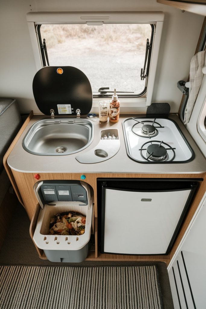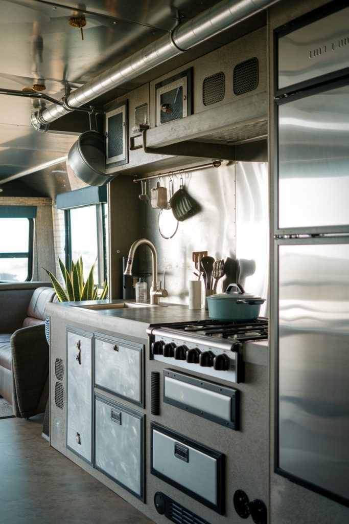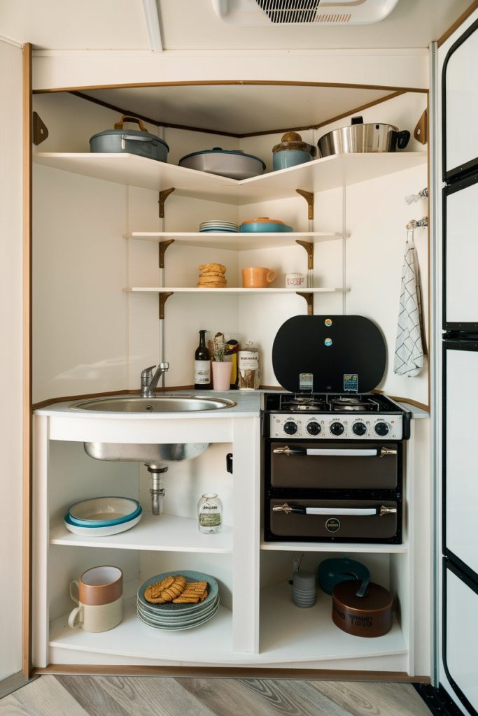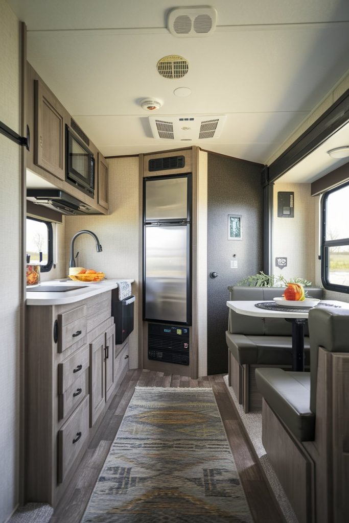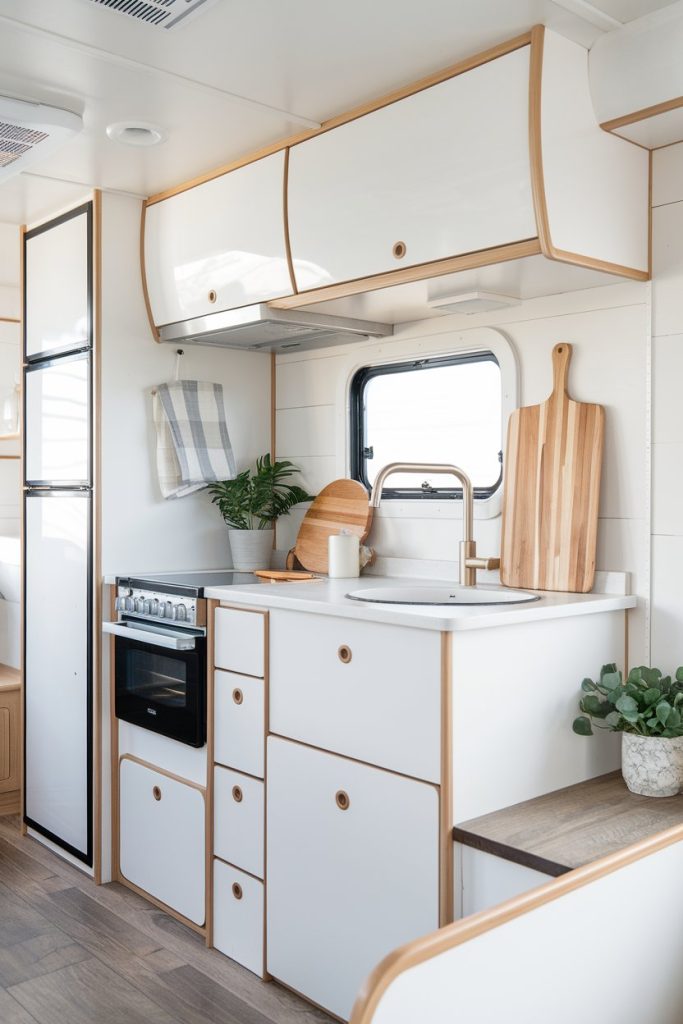 Imagine cooking in a kitchen that feels like a cozy cabin in the woods. This layout features wooden cabinets, a farmhouse sink, and a small oven. The use of natural materials and warm lighting creates a welcoming atmosphere that makes you forget you’re in an RV.