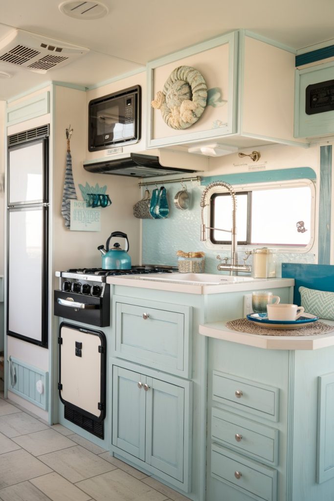 Bring the beach to your RV with this coastal-inspired kitchen layout. Featuring light blue cabinets, seashell decor, and a nautical theme, this kitchen is a relaxing and refreshing space. The use of light colors and natural materials creates a breezy and inviting atmosphere.