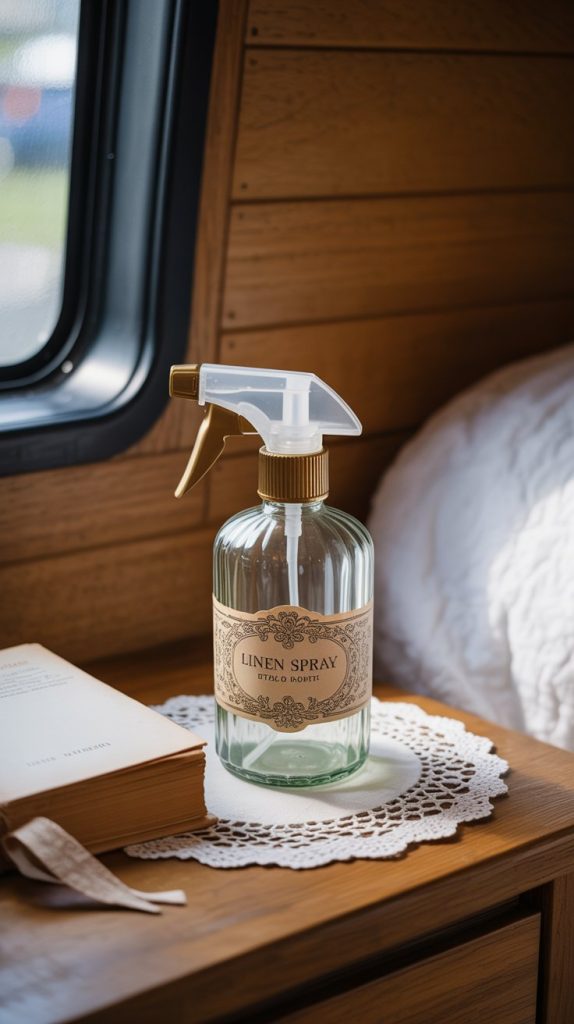 Engage the sense of smell with a beautiful glass spray bottle labeled for linen spray. Fill it with water and a few drops of essential oils like lavender, chamomile, or vanilla to lightly mist your bedding, curtains, and upholstery. This creates a personalized, calming scent for your space and helps freshen fabrics between washes.