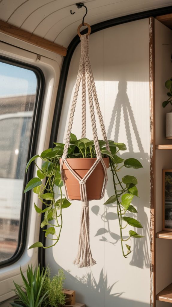 Hanging a plant frees up valuable countertop and table space. It also helps protect your greenery from curious pets or from being knocked over in a tight space. The organic shape of the macramé and the plant provides a lovely contrast to the straight lines of your camper’s walls and cabinets.
