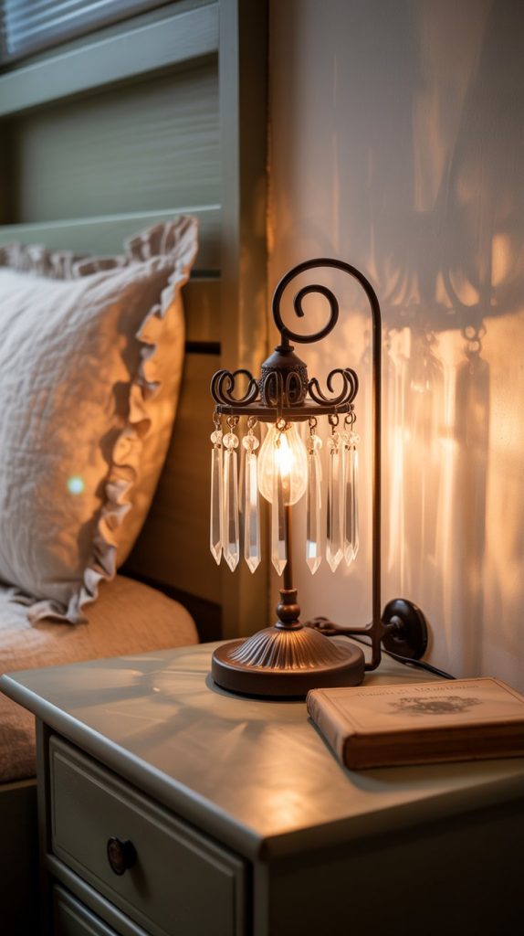 The combination of materials is a hallmark of shabby chic design, blending the “shabby” (the dark, forged iron) with the “chic” (the delicate crystal). When the lamp is turned on, it will cast beautiful, shimmering patterns on your walls and ceiling, creating a magical and romantic atmosphere inside your tiny home.
