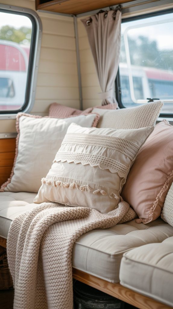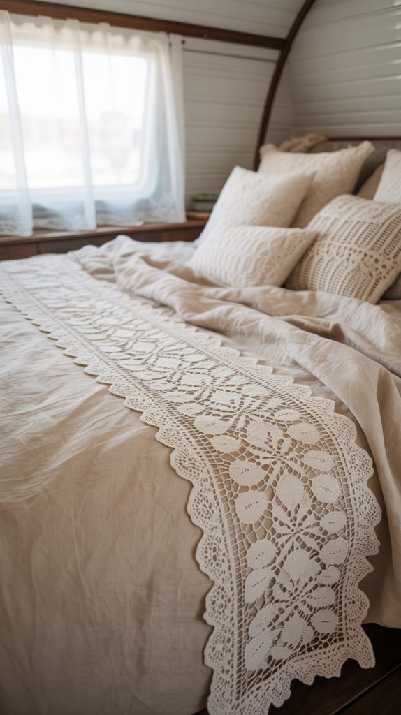 Instantly upgrade your camper’s seating or sleeping area with an assortment of lace-trimmed throw pillows. Mix and match sizes and textures, combining linen, cotton, and chunky knit covers, all adorned with delicate lace, crochet, or embroidered details. These pillows add a layer of comfort and an undeniable touch of feminine, vintage charm that is essential to the shabby chic aesthetic.
