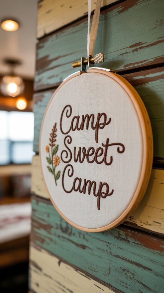 Add a touch of handmade charm and a warm welcome with an embroidered wall hanging. A piece with a phrase like “Camp Sweet Camp,” “Home Is Where We Park It,” or a simple floral motif stitched on linen or muslin fabric embodies the cozy, personal feel of shabby chic. This textile art softens hard walls and makes your camper feel uniquely yours, far from a generic RV.