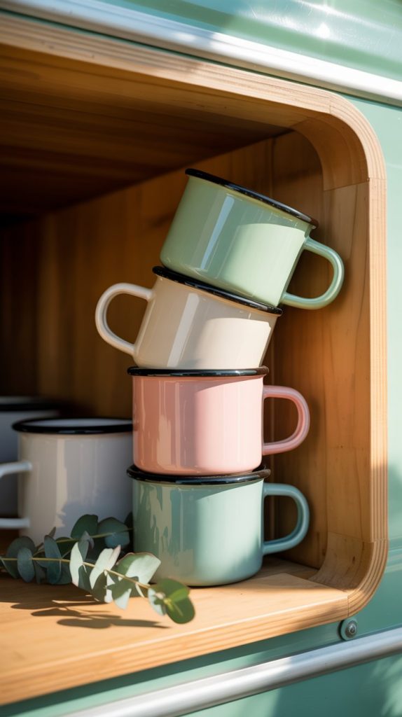 Swap out plain ceramic mugs for a set of pastel-colored enamelware. With their nostalgic, vintage feel and soft hues like mint green, dusty rose, and buttercream, these mugs are both durable and incredibly photogenic. They are lightweight, chip-resistant, and perfect for both your morning coffee inside or a campfire outside.